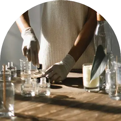 Nuestras fragancias se elaboran con materias primas de alta calidad, combinando aceites esenciales, resinas aromáticas y compuestos odoríferos naturales y sintéticos. Se utilizan en productos cosméticos, de limpieza, velas, ambientadores y más.